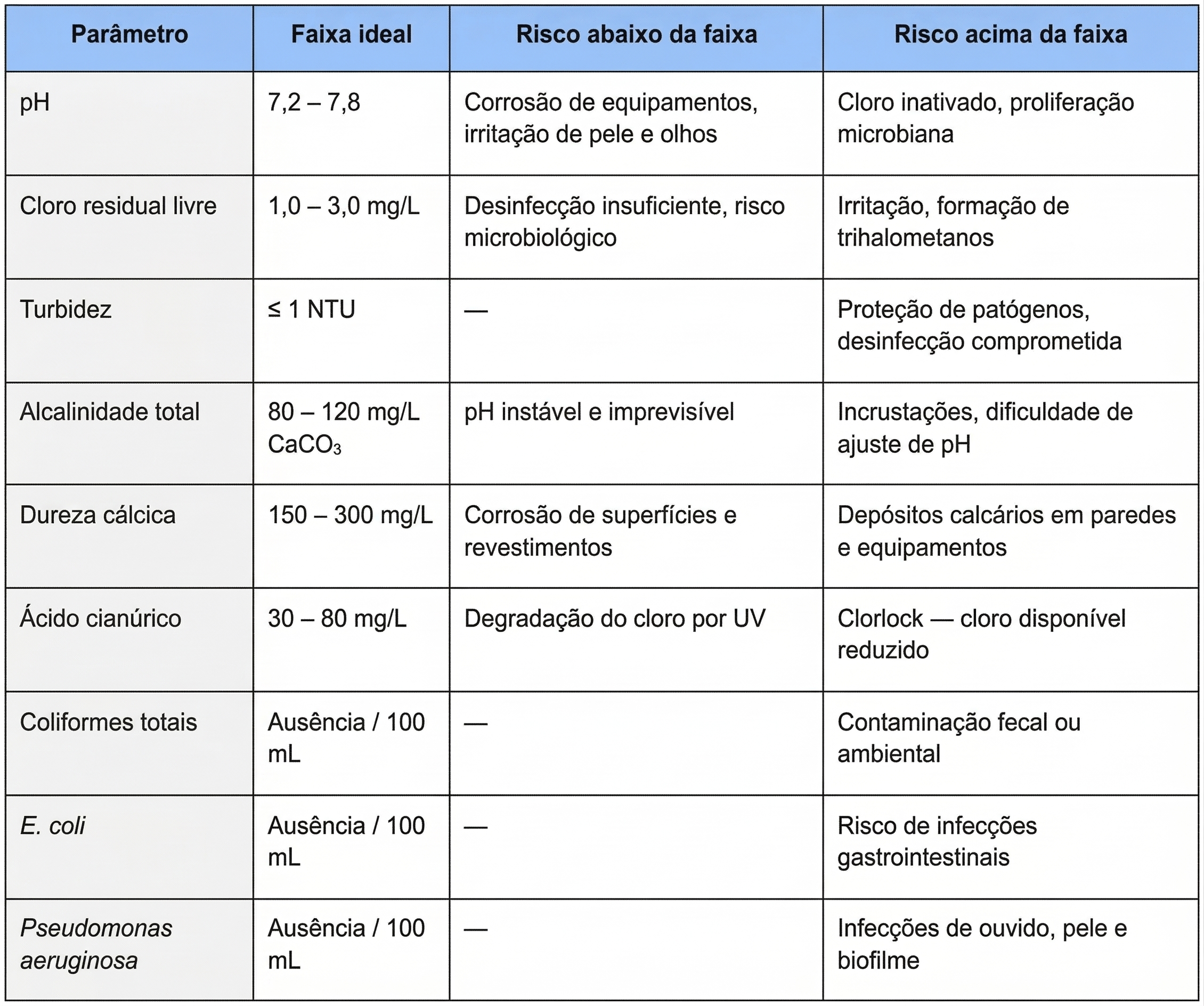 O principal agente de desinfecção deve ser mantido entre 1,0 e 3,0 mg/L em piscinas de uso coletivo. Abaixo de 1,0 mg/L, a ação bactericida é insuficiente. Acima de 3,0 mg/L, causa irritação e forma subprodutos como trihalometanos.